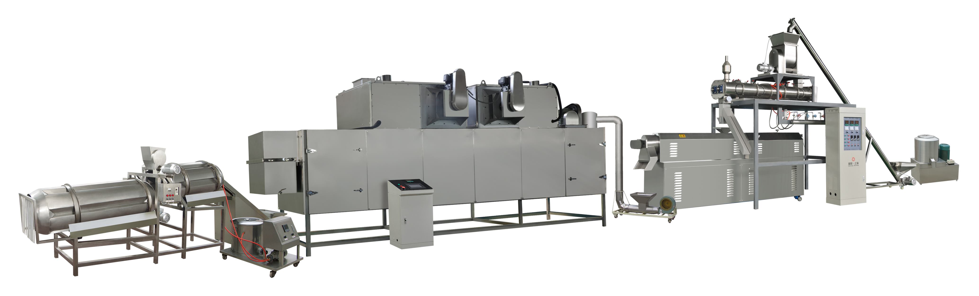 3.膨化烘干工段。大多采用目前先進的雙螺桿寵物食品膨化機,配置節能高效烘干機,膨化效果好,烘干省氣,成本低。
