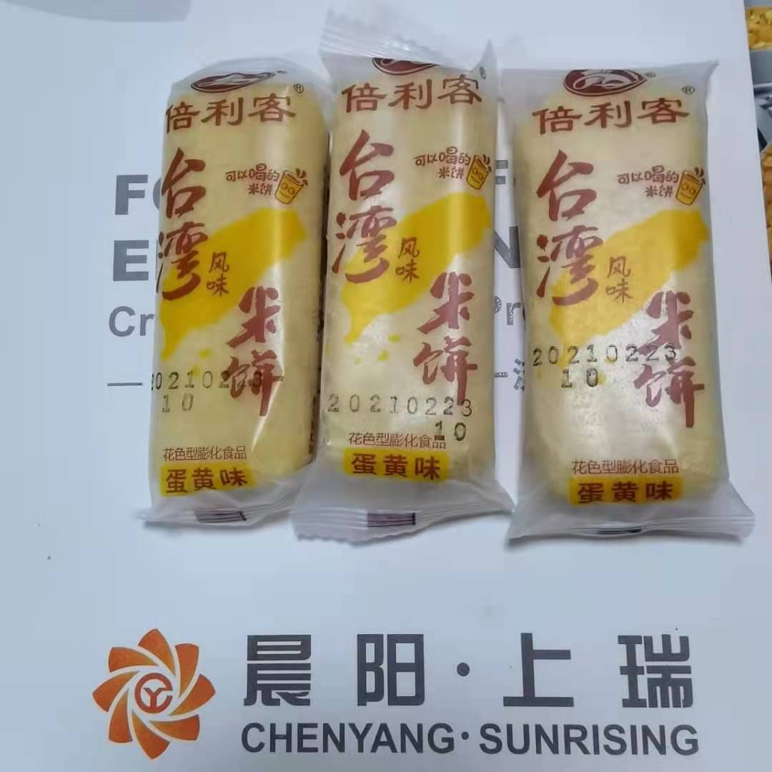 讓我們來簡單介紹一下夾心米果這款膨化工藝的休閑食品吧:夾心米果生產設備 臺灣米餅機器生產線