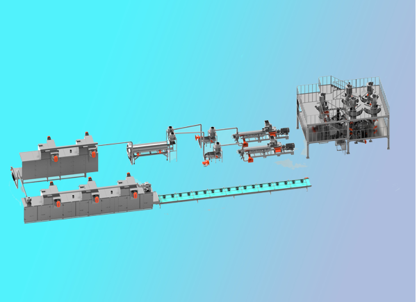 粉碎機→ 攪拌機→ 飼養員→ 擠出機→ 振動篩→ 鼓風機→ 多層烤箱→ 冷卻輸送機→ 包裝機