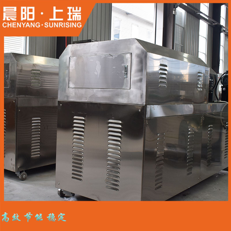 反向旋轉雙螺桿擠壓膨化機一般采用兩根尺寸完全相同,但螺紋方向相反的螺桿。向內旋轉和向外旋轉的區別在于壓力區的位置不同,雙螺桿向內旋轉產生的壓力為上高下低,物料通過雙螺桿時,在入口會產生極高的壓力,造成進料困難,這種向內反向旋轉式很少采用;雙螺桿向外旋轉產生的壓力為上低下高,有利于進料。但反向旋轉與同向旋轉相比,物料在螺桿內形成的C形物料流不能從一根螺桿移向另一根螺桿,物料產生的混合程度顯著降低,其自潔能力也沒有同向旋轉雙螺桿有效和穩定。