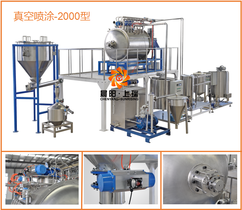 真空噴涂使用晨陽自行研發的第三代真空噴涂機,該真空噴涂系統目前使用臥式單軸漿葉混合機,該機比較適合2噸生產線的產品配置使用,具有高性價比的使用效果。密封閥門使用進口配置,機械密封使用合資配置,減速機使用硬齒面減速機,食品接觸完全304材質。真空狀態下噴涂油脂含量可以到30%,真空壓力達0.095mpa,動態狀態下保壓0.09mpa堅持10分鐘在以上。配置水冷真空泵。油脂,風味劑都是在真空狀態下完成,油脂獨立稱重系統,膏狀風味劑,獨立稱重系統,不同液態使用不同的輸送泵,晨陽公司自行編輯的運行軟件在第三代真空噴涂已經實現完全自動化,穩定化,參數可視化,重要部位數據監視報警,數據存儲,配方留檔等強大功能。