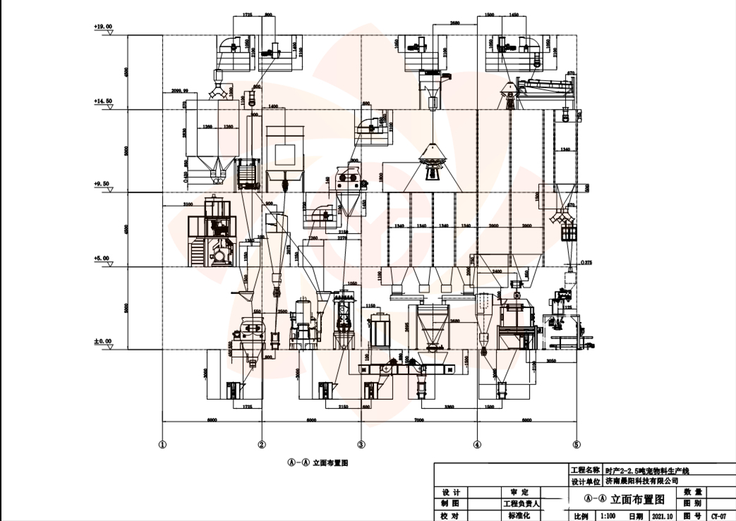 本套2-2.5T/h寵物食品生產線工藝特點,因客戶是空地建設,我司設計首先考慮工藝流程的順暢,在設計上人性化布局,采用4層鋼結構設計,車間建設高度19米(因客戶政府高度限制),工藝方面使用國內主流二次混合,二次粉碎、雙螺桿膨化機、真空噴涂、逆流冷卻,產品混色,包裝碼垛等全部自動流水線。配料倉采用12倉,滿足多種配方配料要求,配料軟件采用布勒系統。配料穩定,可儲存多種配方,配料記錄可留檔查詢,原料混合使用雙軸漿葉混合機,混合均勻度≥98%,雙軸混合機排料殘留低,可保證每批原料的混合均勻度一致,粉碎機工藝采用粗粉加細粉,批次粉碎。避免不同原料進粉碎機因過篩問題產生沉降層。粗粉碎使用臥室錘片粉碎機,粉碎細度20目,產量高。細粉使用超威粉碎機,刀頭使用鎢合碳化鋼,硬度高。粉碎細度80目過篩率95%。保證產品成型表面光滑,無凹凸顆粒狀。在二次混合添加微量元素和一定比例油脂,提高產品油脂含量。膨化機使用雙螺桿膨化機,產品穩定,烘干使用帶式低溫干燥,微量元素熱損低,噴涂使用真空噴涂,油脂添加30%。使用翻板逆流冷卻器,冷卻效果好,配置4倉暫存倉,可以存儲4種不同顏色的產品,每個倉存儲可以到6個小時膨化產能的產品。可以同時四個顏色進行混合,包裝方面配置自動打包稱,自動碼垛機,給帶式包裝機,包裝規格500g-25kg全部實現。