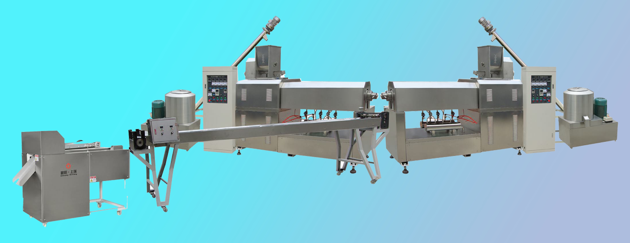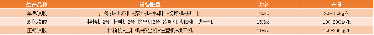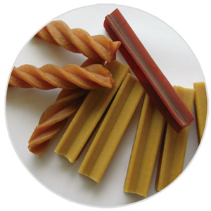 直接擠出型咬膠主要加工條狀、棒狀雙色咬膠,其形狀通過磨具擠壓后直接定型,通過切斷機切斷后達到要求的理想尺寸。其形狀根據產品要求開模,五角星、五棱、六棱、十字、狗骨頭,、雙色熊掌、五花肉等形狀等。