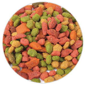 工藝方面寵物食品生產技術可將客戶的配方的體現在產品的形狀、大小、適口性、膨化度以及水分含量等,并可按照客戶要求著色、噴油、噴漿、噴粉以及成品自動混色(料)。