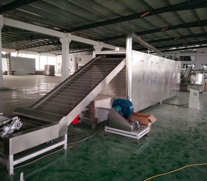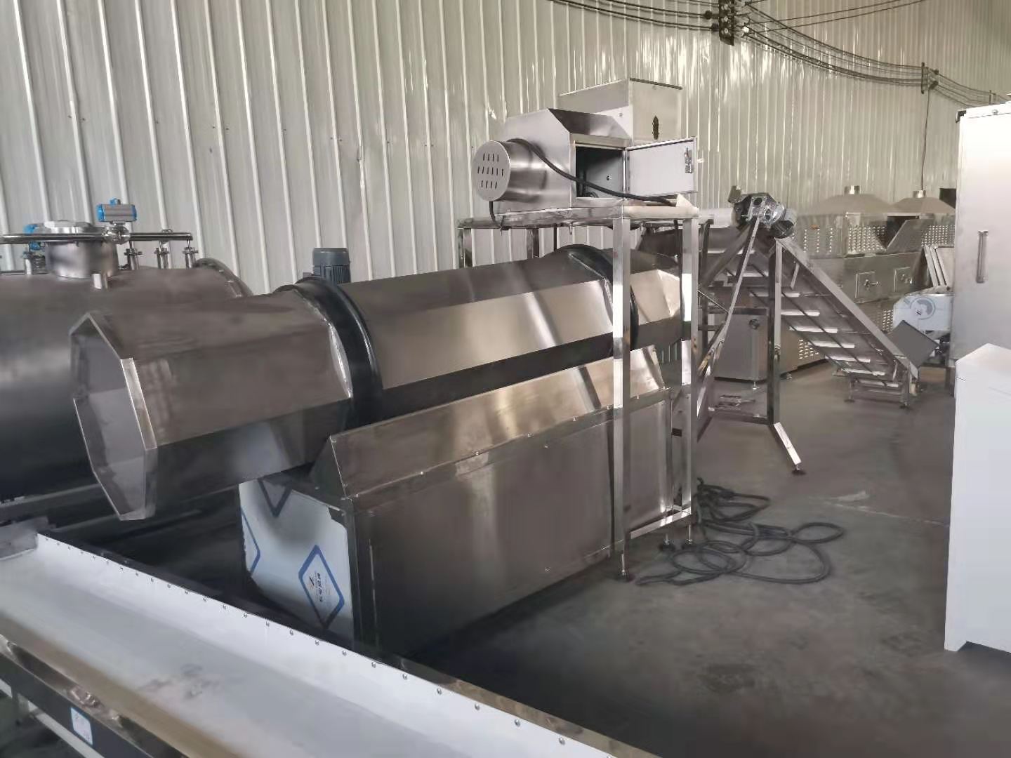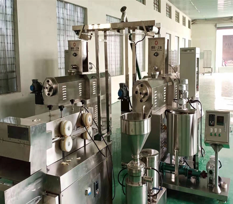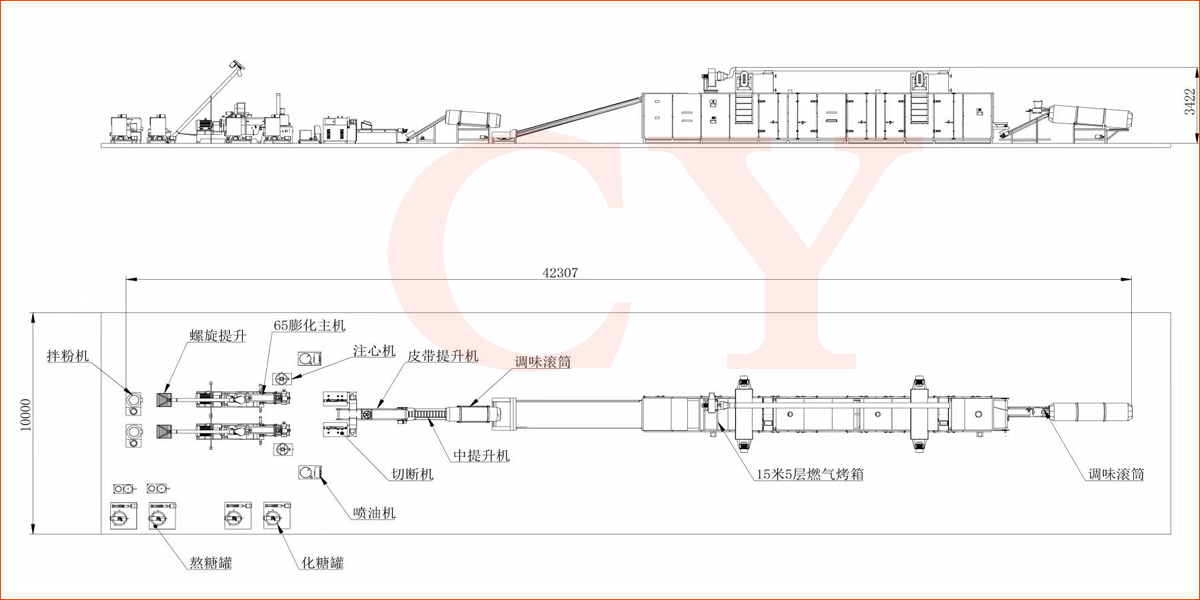 拌粉機→螺旋上料機→雙螺桿膨化機→夾心機-整形切斷機→提升機→六米五層烘干機-雙筒調味機