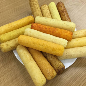 本生產線改變生產工藝流程可以生產夾心米果、米餅、芝麻棒、麥燒、醬油餅等產品。也可用于生產直接膨化型小食品,芝士球、玉米棒、麥香雞塊等產品;本生產烘干機有電熱型和燃氣型可供選擇,根據產能大小合理設計烘干機;調味設備有單滾筒調味機,雙滾筒調味機、稱重式雙頭八角調味機
