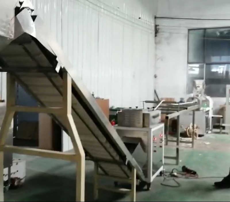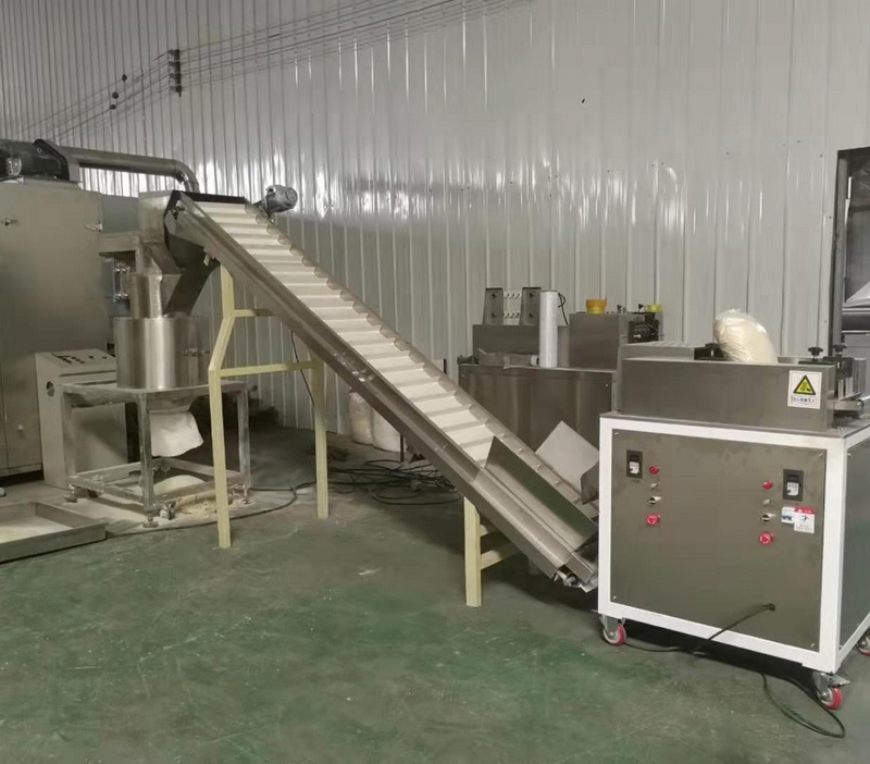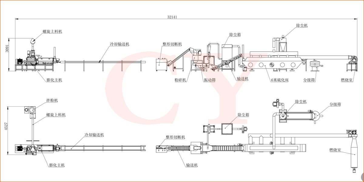 拌粉機→螺旋提料機→膨化主機→冷卻輸送-切斷機→提升機-粉碎機-除塵機-篩選機-提升機-震動硫化床