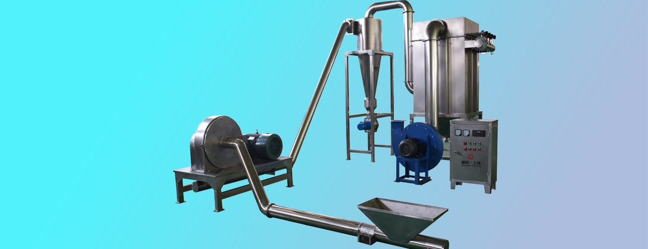 自吸進料管道及料斗、粉碎機主機、薩克龍關風機卸料器、箱式除塵器、脈沖器、引風機、排風管道、控制電柜